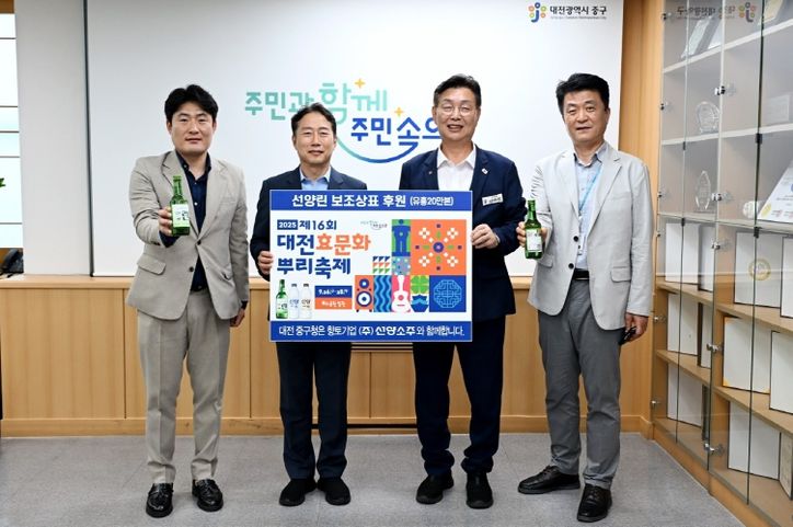 뉴한국방송뉴스통신사 신태공 기자 | 대전 중구는 15일 ㈜선양소주(회장 조웅래)와 제16회 대전효문화뿌리축제의 성공적인 개최를 위한 보조 상표 전달식을 개최했다.