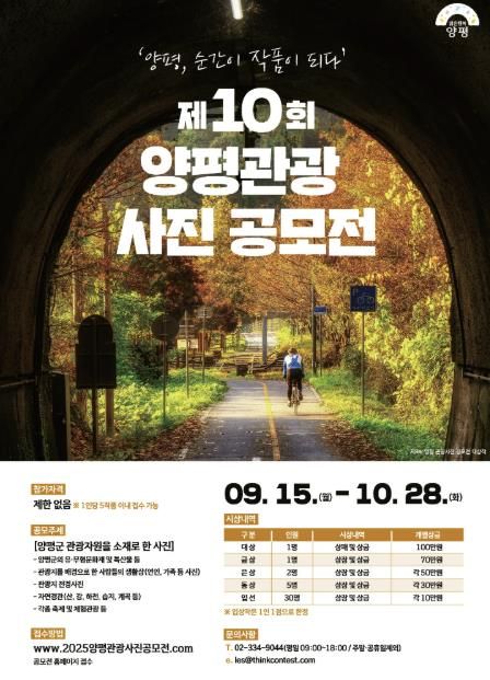 이번 공모전은 10월 28일까지 진행되며, 주제는 양평군의 다양한 관광 자원을 소재로 한 사진이다. 공모전에는 누구나 참여할 수 있으며, 1인당 최대 5점까지 출품할 수 있다.