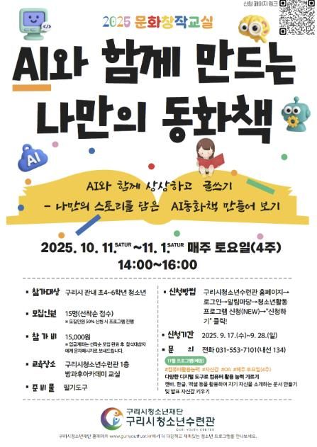 뉴한국방송뉴스통신사 신유철기자 기자 | 구리시청소년재단 청소년수련관은 ‘AI와 함께 만드는 나만의 동화책’ 프로그램 참가 신청을 9월 17일부터 29일까지 받는다고 밝혔다. 신청은 청소년수련관 홈페이지 내 ‘청소년 활동 프로그램 신청’ 메뉴에서 가능하며, 참가 회비는 15,000원이다. 모집은 선착순으로 진행된다.