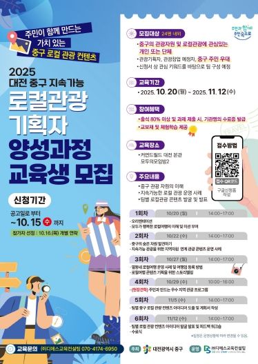모집 대상은 중구의 관광자원 및 로컬관광에 관심 있는 개인 및 관광 창업 예정자 등이며, 중구 주민을 우대하여 선발할 예정이다. 신청은 공고일로부터 10월 15일까지 온라인(구글폼 또는 QR코드)을 통해 가능하다.