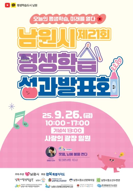 뉴한국방송뉴스통신사 김성의 기자 | 남원시은 오는 26일 사랑의 광장에서 ‘오늘의 평생학습, 미래를 열다’를 주제로 제21회 남원시 평생학습 성과발표회를 개최한다.