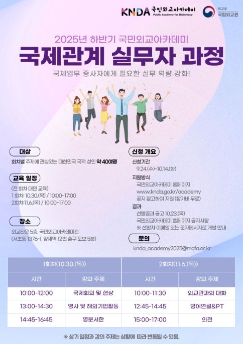 뉴한국방송뉴스통신사 신유철기자 기자 | 외교부 국립외교원은 2025년 하반기 국민외교아카데미 국제관계 실무자 과정 참가자를 9월 24일부터 10월 14일까지 모집한다.