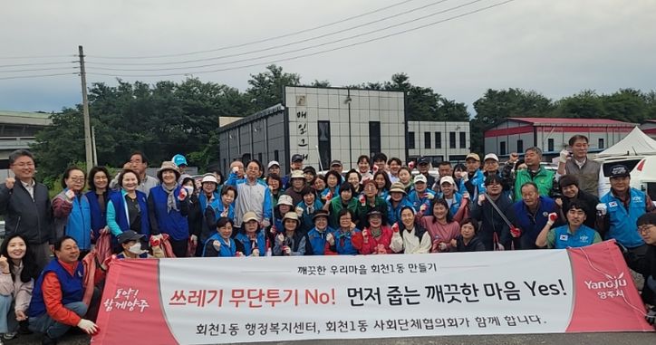 이날 행사에는 회천1동 사회단체 회원 및 주민, 관계 공무원 등 100여 명이 참여하여 관내 주요 도로변과 회암천, 청담천, 신천 일대에 쌓인 쓰레기를 수거하며 환경 정비에 나섰다.