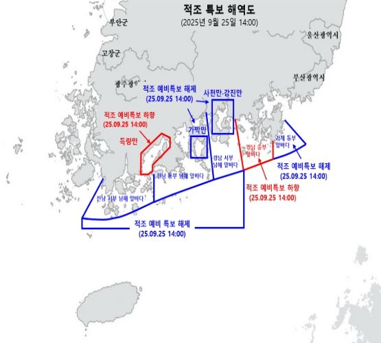 뉴한국방송뉴스통신사 신유철기자 기자 | 해양수산부는 9월 25일 16시부로 적조 위기경보 단계를 ‘경계’에서 ‘주의’로 하향 조정한다고 밝혔다.