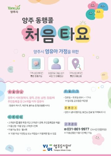 뉴한국방송뉴스통신사 신유철기자 기자 | 양주시가 오는 10월 20일부터 읍·면 지역 24개월 이하 영유아를 동반한 보호자 이동지원차량 ‘처음타요’를 시범 운영한다.