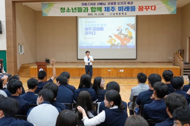 뉴한국방송뉴스통신사 신유철기자 기자 | 오영훈 제주특별자치도지사는 2일 남원중학교(교장 오경석)를 찾아 전교생을 대상으로 특별강연을 열고, “남원과 제주를 넘어 아시아, 나아가 우주까지 여러분의 무대가 돼야 한다”며 청소년들의 꿈과 도전을 격려했다.