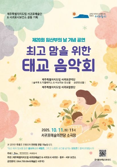 뉴한국방송뉴스통신사 신유철기자 기자 | 서귀포시는 오는 10월 11일 11시 서귀포예술의전당 소극장에서 제주특별자치도립 서귀포예술단과 서귀포보건소가 공동으로 주관하는 제20회 임산부의 날 기념 공연 '최고 맘을 위한 태교음악회'를 개최한다.
