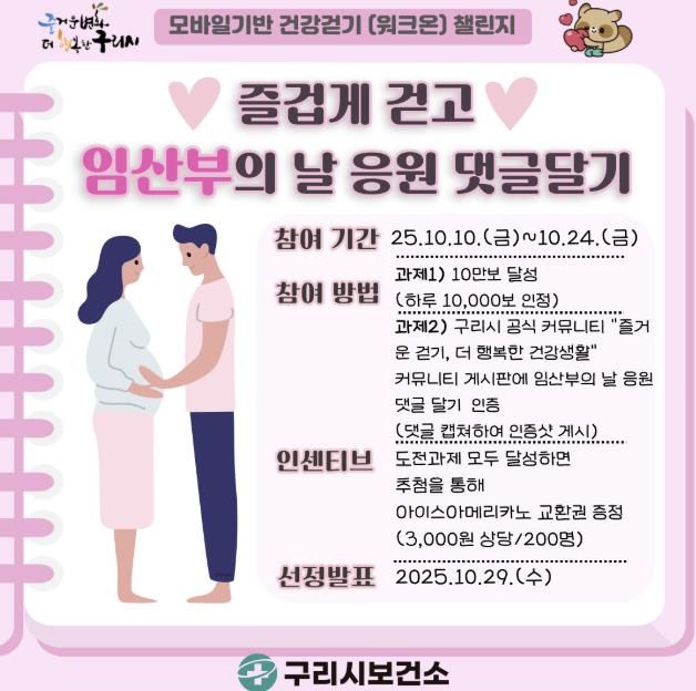 이번 챌린지는 시민들이 걷기 운동을 통해 신체 활동을 증진하고, 임산부를 존중하고 응원하는 사회적 분위기를 조성하기 위해 기획됐다. 참여는 모바일 앱 ‘워크온(WalkON)’을 통해 가능하며, 구리 시민 누구나 참여할 수 있다.