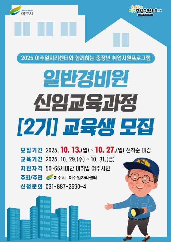 뉴한국방송뉴스통신사 신유철기자 기자 | 여주시는 10월 13일부터 10월 27일까지 베이비부머(중장년) 취업지원을 위한 ‘2025년 일반경비원 신임교육과정 2기 교육생’을 모집한다.