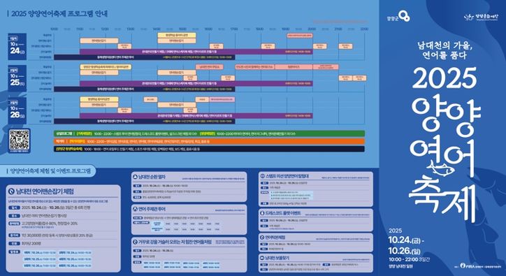 양양군과 (재)양양문화재단이 공동 주최·주관하는 이번 축제는 ‘남대천의 가을, 연어를 품다’를 주제로 연어의 회귀 본능을 상징적으로 표현하며, 생태·체험·문화가 어우러진 복합형 지역축제로 진행된다.