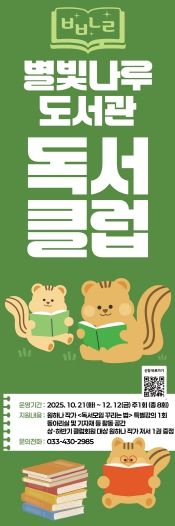 홍천군은 별빛나루도서관에서 10월 21일부터 12월 11일까지 ‘2025년 하반기 독서클럽’을 운영한다고 밝혔다.