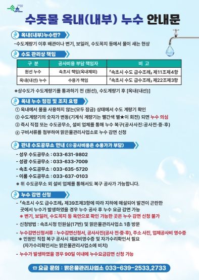 뉴한국방송뉴스통신사 양호선기자 기자 | 속초시가 ‘수돗물 누수 안내문’을 제작·배포하며 생활 속 물 절약 실천 확산에 나섰다.