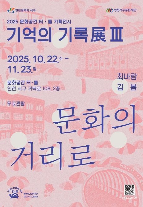 뉴한국방송뉴스통신사 신유철기자 기자 | 인천서구문화재단은 10월 22일부터 11월 23일까지 문화공간 터·틀(석남)에서 기획전시 기억의 기록展 세 번째 시리즈 ‘문화의 거리로’를 개최한다.
