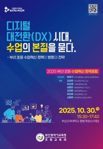 뉴한국방송뉴스통신사 신유철기자 기자 | 부산광역시교육청은 오는 30일 오후 부산교육대학교 참빛극장에서 초등 교원과 교육전문직원 등 200여 명을 대상으로 ‘디지털 대전환(DX)* 시대, 수업의 본질을 묻다’를 슬로건으로 ‘2025 부산 초등 수업혁신 정책포럼’을 개최한다고 밝혔다.