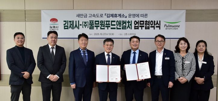 뉴한국방송뉴스통신사 김성의 기자 | 김제시는 27일 ㈜풀무원푸드앤컬처와 '새만금전주간' 고속도로 개통에 따라 새롭게 조성되는‘김제휴게소’운영에 따른 업무협약을 체결했다고 밝혔다.