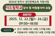 뉴한국방송뉴스통신사 양호선기자 기자 | 원주시 평생교육원 학습관에서 12월 22일부터 26일까지 2026년 원주시 성인문해교육 지원사업 '더드림학교' 강사 및 자원봉사자를 모집한다. 이번 문해교육 강사는 학령기 교육의 기회를 놓친 비문해 성인을 대상으로 더디딤 6개반, 더채움(성인생활문해) 5개반, 더열림(찾아가는 성인문해교실) 3개반, 더터치(디지털문해) 5개반 등 전문적인 문해교육을 수행할 교육강사 19명, 자원봉사자 19명, 총 38명을 모집한다. 지원자는 신청서를 작성해 평생교육원 학습관에 방문 접수하면 되고, 선발은 1차 서류 심사와 2차 면접 및 수업 시연으로 이루어진다. 심사에서는 ▲강사 경력 및 자격 ▲강좌 운영 적합성 ▲지원자의 전문성 ▲강의 계획의 적정성 ▲강의 능력 등을 종합적으로 평가해 최종 합격자를 선정한다. 윤석재 학습관장은 “비문해 어르신들에게 질 높은 문해교육을 제공하여 학습자들의 자존감 향상에 기여할 역량 있는 강사와 자원봉사자의 많은 관심과 참여를 기대한다.”라고 말했다. [뉴스출처 : 강원도 원주시]