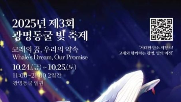 뉴한국방송뉴스통신사 신유철기자 기자 | 광명도시공사는 오는 10월 24일 금요일부터 25일 토요일까지 이틀간 “2025년 제3회 광명동굴 빛 축제”를 개최한다. 올해로 3회째를 맞이하는 이번 축제는 광명동굴에서 열리는 대표 축제로 광명의 상징인 빛과 환경을 주제로 화려한 드론라이트쇼와 함께 탄소중립과 환경 보존의 가치를 담아냈다. 특히 이번 축제는 “고래의 꿈, 우리의 약속”이라는 슬로건 아래 미래 세대와 함께 지구를 지키자는 탄소중립에 대한 메시지를 전한다. ‘수천그루의 나무를 심는 것보다 고래 한 마리를 지키는 것이 탄소저감에 더 효과적이다’라는 논문 결과가 있을 만큼 거대한 탄소 저장소로 불리는 고래가 축제의 주인공이다. 고래는 지속 가능한 미래와의 공존을 상징하며, 탄소중립 실천은 그 미래를 지켜내기 위한 우리의 약속이다. 이번 축제로 공사는 시민과 함께하는 탄소중립 도시 광명의 비전을 보여주고자 한다. 축제가 진행되는 이틀 동안 저녁에는 1,000대의 드론이 광명동굴의 밤하늘을 화려하게 밝힌다. 드론라이트쇼에 앞서 친환경 놀이터, 업사이클링 체험, 광명시환경교육센터 생태교육 등 다양한 환경 체험 부스를