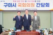 뉴한국방송뉴스통신사 신유철기자 기자 | 구미시는 9월 30일 국회를 방문해 구자근, 강명구 지역구 국회의원과 간담회를 열고 지역 주요 현안과 국비 확보 전략을 논의했다. 이날 간담회에는 김장호 시장을 비롯해 구미시 주요 간부 공무원 등 30여 명이 참석했다. 시는 현안 사업 추진 상황과 정부 예산 동향을 공유하며 국회 차원의 전략적 지원 방안을 모색했다. 주요 현안사업으로는 △구미국가산업단지 1~3단지 연결교량 신설 △구미~신공항 철도건설 △대한민국역사박물관(구미산업화역사관) 건립 △새마을운동중앙회 및 연수원 유치 △'5극 3특'국가균형성장 전략 대응 △한국은행 구미지역본부 유치 △'방위산업 소재ㆍ부품ㆍ장비 특화단지'유치 △국가 푸드테크 클러스터 조성 등이 논의됐다. 주요 국비사업으로 △구미시 제조창업 인큐베이팅 센터 구축 △AX 실증산단 구축 사업 △지역 주력 중소기업형 인공지능 데이터 스페이스 구축 △차세대 디스플레이 핵심부품ㆍ소재 기술개발 △반도체 장비 챔버용 소재부품 제조 및 검증 테스트베드 구축 △수요확대형 배터리 테스트베드 구축 △구미 산동 국민체육센터 조성 △푸드테크 연구지원센터 구축 △펫테크 산업화 지원센터