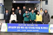 뉴한국방송뉴스통신사 김성의 기자 | 광산구의회가 29일 광주송정역 앞에서 ‘광주송정역 광장 확장 사업’을 국가사업으로 추진할 것을 촉구하는 성명서를 발표했다. 박해원 의원(더불어민주당, 첨단1·2동)이 대표 발표한 성명서에 따르면, 광주송정역은 호남권 철도교통의 핵심 거점으로 하루 평균 이용객 수가 2022년 약 9,800명에서 2024년 약 1만 2천 명으로 증가했다. 반면 협소한 역사 규모와 낙후된 주변 환경으로 이용 불편이 초래되고, 도시의 첫인상과 지역 발전을 저해하고 있다는 지적이다. 광산구의회는 “총사업비 386억 원을 투입해 광주송정역 역사 면적을 약 두 배로 확장하는 증축 공사가 2028년 준공을 목표로 추진 중”이라면서도, “급증하는 수요와 향후 통합 특별시의 철도 거점 역할을 고려할 때, 역사 증축만으로는 한계가 있어 광장 확장과 기능 개선이 반드시 병행돼야 한다”고 주장했다. 이어 “광산구는 2022년 12월부터 국토교통부에 역사 확장 공사와 연계한 역 광장 개선의 필요성을 지속적으로 건의해 왔지만, 국가사업 대상에서 제외됐다”며 “구 자체 예산으로 일부 리모델링을 추진하기로 했으나, 이는