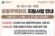 뉴한국방송뉴스통신사 신유철기자 기자 | 영등포구가 공동주택 주민의 쾌적하고 안전한 생활여건 조성을 위해 ‘2026년 공동주택관리 지원사업’을 추진한다고 밝혔다. ‘2026년 공동주택관리 지원사업’은 관내 공동주택관리법의 적용을 받는 20세대 이상 공동주택을 대상으로 공용시설물의 유지관리에 필요한 사업비를 지원하는 사업이다. 구는 올해 총 9억 원의 예산을 투입해 관내 공동주택 단지별로 필요 사업비의 50~70% 이내, 최대 5,000만 원까지 지원할 계획이다. 지난해 구는 공동주택관리 지원사업으로 67개 단지에 83개 사업을 지원했다. 특히 위험수목 전지, 경로당 개보수, 어린이놀이시설 개보수 등을 통해 안전사고 예방은 물론 사회적 약자와 소외계층의 주거환경 개선에 기여했다. 올해는 지난해 대비 1억 원 확대된 예산을 바탕으로 입주민의 안전 확보와 함께 사회적 약자 및 소외계층을 지원한다. 주요 지원 분야는 ▲노인 편의시설 및 여가시설 설치·보수 ▲장애인 편의시설의 설치·개선 ▲공동주택 근로자 근무환경 개선(냉·난방기, 공기청정시설, 화장실·샤워실 개선 등) ▲보수‧보강이 필요한 공동주택 시설물 개선 사업 등이