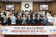 뉴한국방송뉴스통신사 신유철기자 기자 | 경기도여주교육지원청은 10월 15일, 여주시의회 본회의장에서 '2025 여주 청소년교육의회 발표회 및 폐원식'을 개최했다. 이번 행사는 지난 6개월 동안 여주 청소년들이 직접 기획·참여한 사회참여활동 결과를 공유하고, 의정활동을 마무리하는 자리로 마련됐다. 이날 행사에는 김상성 교육장을 비롯해 박두형 여주시의회 의장과 여섯 명의 시의원, 청소년교육의회 의원 36명 및 학부모가 참석해 청소년들의 성장과 노력을 함께 축하했다. 여주교육지원청 김상성 교육장은 격려사에서 “청소년의 목소리가 지역사회를 변화시키는 힘이 된다”며 “여러분의 작은 실천이 여주의 미래를 밝히는 등불이 되기를 바란다”고 전했다. 또한 박두형 여주시의회 의장은 “여주시의회도 여러분의 제안을 귀 기울여 듣고, 청소년이 행복한 도시를 만드는 데 함께하겠다”고 격려했다. 이날 발표회에서는 청소년의회 5개 상임위원회(환경·복지·인성·시설·교육)가 각 분과별로 진행한 사회참여활동과 정책제안서를 공유했다. 환경위원회는 ‘지속 가능한 여주를 위한 생활 속 실천 방안’을, 복지위원회는