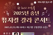 뉴한국방송뉴스통신사 신태공 기자 | 대전 서구가 한 해를 마무리하고 새해를 맞는 무대를 선사한다. 서구는 오는 12월 23일 구청 2층 구봉산홀에서 ‘2025년 송년 뮤지컬 갈라 콘서트’를 개최한다고 10일 전했다. 공연은 90분간 진행되며 뮤지컬 배우 이건명과 라움앙상블이 출연한다. ‘맘마미아’ 메들리와 ‘영웅’ 등 대중적 인지도가 높은 작품을 비롯해, 캐롤 메들리 등 연말 분위기를 담은 무대가 선보인다. 이달 22일까지 서구청 홈페이지의 [구민참여] 게시판 [통합예약시스템]에서 예약받는다. 추가적인 사항은 서구 문화체육과로 문의하면 된다. 서구 관계자는 “올 한 해 구민 여러분이 서구에 보내주신 사랑과 관심에 감사드린다”며 “앞으로도 구민들의 문화 향유 기회 확대를 위해 지속적으로 노력하겠다 ”고 전했다. [뉴스출처 : 대전시 서구]
