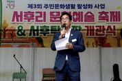 뉴한국방송뉴스통신사 신유철기자 기자 | 양평군 서종면은 지난 11일 서후리 마을회관 일원에서 ‘제3회 서후리 문화예술축제 및 탁구장 개관식’을 성황리에 개최했다. 이날 행사에는 홍주표 서종면장과 박명숙·이혜원 경기도의회 의원, 지역 기관·단체장, 평생학습센터 회원, 주민 등 200여 명이 참석해 마을의 문화와 소통이 어우러진 뜻깊은 시간을 가졌다. 행사에서는 평생학습센터 회원들이 준비한 다양한 작품 전시와 공연이 진행되며, 주민들의 재능과 열정을 나누는 무대가 마련됐다. 이어 진행된 탁구장 개관식에서는 새롭게 조성된 생활체육 공간을 둘러보며, 향후 마을 공동체의 건강한 여가활동 거점으로서의 역할에 대한 기대를 나눴다. 홍주표 서종면장은 “주민 여러분이 함께 준비한 문화예술축제와 탁구장 개관은 서종면 공동체의 또 다른 도약을 상징한다”며, “앞으로도 주민이 주도하는 생활문화와 건강한 여가문화가 자리 잡을 수 있도록 지속적인 지원을 아끼지 않겠다”고 밝혔다. 한편, 이번 행사는 지역 주민의 참여로 이뤄진 생활문화 축제이자 건강한 공동체 회복의 장으로, 문화와 체육이 조화를 이루는 서종면의 새로운 지역