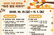 뉴한국방송뉴스통신사 신유철기자 기자 | 제주별빛누리공원은 10월 31일과 11월 1일 이틀간 누구나 자유롭게 참가할 수 있는 ‘2025년 가을 밤하늘 제주별빛이야기’ 행사를 개최한다. 이번 행사는 저녁 7시부터 9시 30분까지 현장 참여로 진행되며, 주요 프로그램으로는 야외 행사인 ‘우주로의 산책’, ‘망원경체험’, ‘별빛버스킹’과 11월 1일 ‘별빛강연’으로 구성됐다. `우주로의 산책`은 야외에서 도내외 아마추어 천문가들의 다양한 망원경으로 가을 밤하늘에 보이는 토성, 달 그리고 다양한 별을 관측하고 궁금한 점을 물어볼 수 있는 프로그램이다. `망원경체험`은 태양계 광장에서 별자리 설명을 듣고, 참여자가 직접 천체망원경을 조작하여 달을 찾아보는 체험이다. `별빛버스킹`은 가을 밤하늘 아래 다양한 곡을 오카리나와 에어로폰 연주로 들어볼 수 있는 공연으로 하루 두 차례(저녁 7시 30분, 8시 30분) 진행한다. 돗자리를 준비하면 자유로운 자리에서 감상할 수 있다. `별빛강연`은 별도 참가 비용은 없으며, 11월 1일 1부와 2부로 나눠 열린다. 1부(오후 2시 30분) ‘남