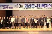 뉴한국방송뉴스통신사 권영분기자 기자 | 충북 괴산군은 29일 괴산군 문화예술회관에서 ‘제13회 괴산군 사회복지의 날 기념행사’를 개최했다고 밝혔다. 이번 행사는 괴산군사회복지협의회(회장 고명성) 주관으로 열렸으며, 송인헌 괴산군수를 비롯한 사회복지시설 종사자 등 200여 명이 참석한 가운데 사회복지인의 노고를 격려하고 화합을 다지는 자리로 마련됐다. 행사는 장연지역아동센터 합창단의 식전공연을 시작으로, 괴산군사회복지협의회 회장 이·취임식, 유공자 표창, 인사말, 퍼포먼스 순으로 진행됐다. 이날 이·취임식에서는 최은묵 전 회장에 이어 고명성 신임 회장이 취임했으며, 유공자 표창 수여식에서는 지역 사회복지 증진에 기여한 12명이 표창을 받았다. △군수 표창은 배기만(괴산지역자활센터), 이정자(성제노의집), 심서경(괴산재가복지센터), 이충정(괴산군노인복지관), 안미경(청천재활원), 천병주(수달지역아동센터), 이봉우(햇살재가복지센터), 이정민(괴산군 가족행복과) 등 8명이 수상했다. △군의장 표창은 신미경(괴산지역자활센터), 이만형(청천재활원) 등 2명, △괴산군사회복지협의회장 표창은 조경옥(