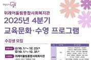 뉴한국방송뉴스통신사 신유철기자 기자 | 성남시는 오는 9월 19일까지 위례어울림종합사회복지관의 120개 강좌 수강생 2896명을 모집한다. 모집은 수영(76개 강좌, 1840명), 교육문화(44개 강좌, 1056명) 등 2개 분야에서 이뤄진다. 수영 분야는 △강습 수영(16회·회당 60명) △아쿠아로빅(4회·회당 60명) △자유수영(8회·정기권 1개월 60명, 일일권 현장접수 20명) 등의 프로그램을 오는 10월 1일부터 12월 31일까지 운영하며, 1인 1강좌만 신청할 수 있다. 교육문화 분야는 유아, 아동, 성인 등 대상별 프로그램을 오는 10월 1일부터 12월 23일까지 운영한다. 유아(5~7세) 대상 강좌는 △창의미술(1회·15명) △영어동화 스토리텔링(1회·15명) 등이다. 아동(8~13세) 대상 강좌는 △한자 자격증반(2회·회당 15명) △바둑·체스(1회·20명) △농구교실(3회·회당 15명) △창의미술(1회·15명) △K-POP댄스(1회·20명) △주산 암산(1회·20명) △로봇 코딩교실(1회·15명) △성장요가(2회·회당 15명) △태블릿 드로잉교실(1회·회당 15명) 등