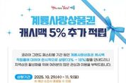 뉴한국방송뉴스통신사 신태공 기자 | 계룡시는 코리아 그랜드 페스티벌 기간 동안 지역 내 소비 활성화를 위해 모바일 계룡사랑상품권 사용 시 캐시백 적립률을 한시적으로 5% 추가하여 13%에서 18%로 상향한다고 밝혔다. 이번 혜택은 국가단위 할인행사인 ‘코리아 그랜드 페스티벌’ 기간에 맞춰 침체된 지역상권에 활력을 불어넣고, 시민들에게 실질적인 소비 혜택을 제공하기 위한 것으로 10월 29일부터 11월 9일까지 12일간 시행된다. 단, 예산 소진 시 5% 추가 적립은 조기 종료될 수 있다. 모바일 계룡사랑상품권은 행사 기간 동안 18% 캐시백이 적용되며, 종료 후 올해 말까지는 13% 적립률이 유지되고 구매 한도는 월 50만 원, 보유 한도는 100만 원이다. 상품권은 구글 플레이스토어 또는 앱스토어에서 ‘지역상품권 chak’ 앱을 설치한 뒤 회원가입을 통해 간편하게 구매할 수 있다. 시는 이번 캐시백 확대를 통해 시민들의 소비 참여를 유도하고, 소상공인과 영세상권의 매출 증대에 도움이 될 것으로 기대하고 있다. 이응우 계룡시장은 “코리아 그랜드 페스티벌과 연계한 이번 캐시백
