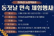 뉴한국방송뉴스통신사 신다은기자 기자 | 전라남도농업박물관은 잊혀가는 전통 절기 문화인 동짓날의 의미를 되새기기 위해 21일 오전 10시부터 12시까지 박물관 쌀 체험실에서 ‘동짓날 민속 체험행사’를 연다. 동지는 24절기 가운데 22번째 절기로, 양력으로는 한 해의 마지막에 해당한다. 예부터 낮이 가장 짧고 이후 해가 길어지기 시작하는 절기로 인식됐다. 오늘날에도 동짓날 팥죽을 먹는 풍습이 이어져 전통 절기 가운데 비교적 친숙한 명절로 남아 있다. 행사는 동짓날의 절기적 의미와 전통 민속을 소개하고, 동지팥죽을 만들어 보는 체험 중심 프로그램으로 구성됐다. 선착순 70명이며, 참가 신청은 전남도농업박물관 누리집에 하면 된다. 참가비는 무료다. 김옥경 전남도농업박물관장은 “점차 사라지는 전통 절기 문화에 대한 관심을 높이는 계기가 될 것”이라며 “온가족 함께 동지 민속을 체험하면서 한 해의 마지막 절기가 지닌 의미를 되새기는 자리가 되길 바란다”고 말했다. [뉴스출처 : 전라남도]