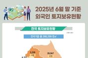 뉴한국방송뉴스통신사 신유철기자 기자 | 국토교통부는 2025년 6월말 기준 외국인 토지·주택 보유통계를 공표했다. 2025년 6월말 외국인 보유 토지면적은 268,299천㎡로 2024년 12월 대비 0.15% 증가했으며, 증가율은 직전 대비 0.7%p 감소(0.85→0.15%)했다. 2025년 6월말 외국인 소유 주택수는 10.4만호로 2024년 12월 대비 3.8% 증가(10→10.4만호)했으며, 증가율은 직전 대비 1.6%p 감소(5.4→3.8%)했다. 지난 8월 21일 수도권 일부 지역을 외국인 토지거래허가구역으로 지정한 점을 고려하면 올해 말까지의 증가율은 더욱 감소할 것으로 전망된다. 외국인이 보유한 국내 토지면적은 268,299천㎡로, 전체 국토면적(100,459,874천㎡)의 0.27% 수준이다. 국적별 비중은 미국(53.3%), 중국(8.0%), 유럽(7.1%) 등으로 나타났고, 지역별로는 경기(18.5%), 전남(14.7%), 경북(13.5%) 등으로 나타났다. 용도별 비중은 기타(67.7%), 공장용(22.0%), 주거용(4.3%)등으로 나타났고, 주체별로