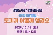뉴한국방송뉴스통신사 신유철기자 기자 | 구리시 갈매도서관은 국악뮤지컬 '토끼가 어떻게 생겼소' 무료 관람 사전 신청을 11월 25일부터 갈매도서관 홈페이지에서 선착순으로 신청받는다고 밝혔다. 국악뮤지컬 '토끼가 어떻게 생겼소'라는 연말을 맞아 오는 12월 13일 오전 11시, 갈매도서관 6층 대강당에서 경기아트센터와 함께 어린이와 가족을 위해 마련된 공연이다. 이번 공연은 지역 주민들의 연말 문화 향유 기회를 확대하고자 기획됐으며, 우리 전통 판소리‘수궁가’를 모티브로 새롭게 창작된 어린이 가족 국악뮤지컬이다. 익숙한 이야기와 흥겨운 음악이 어우러져 생동감 넘치는 무대가 펼쳐질 예정이다. 특히 작품 속에는 바다 생태계를 지키는 내용과 환경의 중요성을 담은 메시지가 포함되어 있어, 관람객들이 공연을 즐기면서 자연보호의 의미를 자연스럽게 배울 수 있는 시간이 될 것으로 기대된다. 백경현 구리시장은 “이번 공연이 아이들과 가족들이 함께 웃고 공감하며 환경의 소중함을 느낄 수 있는 시간이 될 것”이라며 “환경 특화도서관으로 자리 잡은 갈매도서관에서 앞으로도 환경을 생각하고 환경의 가치를 깨닫는 다양한 프로