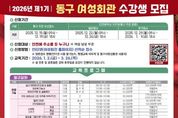 뉴한국방송뉴스통신사 신유철기자 기자 | 인천 동구는 2026년 1월9일까지 ‘2026년 제1기 동구 여성회관 수강생’을 모집한다고 밝혔다. 2026년 1월2일부터 3개월 과정으로 진행되는 제1기 정규강좌 프로그램은 수강생들로부터 자격증 취득과 취업을 이끌어내 호평을 받은 실내인테리어(도배 및 필름) 등의 자격증 취득 프로그램과 어반스케치, 민화 그리기를 포함한 요리·공예 프로그램 등 총 26개 과정으로 운영된다. 특히 2025년 많은 수강생이 커피 바리스타 2급을 취득한 기존 커피 바리스타 강좌에 신규로 야간 강좌까지 추가되어 카페 취업이나 창업에 도움이 될 수 있도록 했다. 또한 한식 디저트 만들기 강좌와 장 담그기, 전통 헤어 강좌는 실생활 활용도가 높은 프로그램으로, 1개월 단기 특강으로 운영해 주민들이 부담 없이 참여할 수 있도록 구성했다. 일일 무료 특강으로는 일일민화그리기 특강과 커피 원데이 클래스가 준비됐다. 수강 신청은 인천 거주자를 대상(동구 주민 우선)으로 여성회관 홈페이지를 통해 선착순 접수하며, 온라인 접수에 불편을 겪는 분이나 동구사랑상품권·평생교육 바우처 사용자