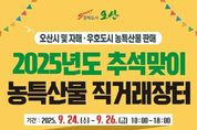 뉴한국방송뉴스통신사 신유철기자 기자 | 오산시는 민족 최대 명절 추석을 맞아 오는 24일(수)부터 26일(금)까지 3일간 오산시청 광장에서 ‘추석맞이 자매도시 농특산물 직거래장터’를 개최한다고 밝혔다. 올해 직거래장터에는 영동군, 속초시, 순천시, 진도군, 남해군, 장수군, 남원시, 공주시, 오산시 등 총 9개 시군에서 24개 업체가 참여한다. 규모 있는 장터답게 제수용품부터 선물세트까지 명절 상차림에 필요한 다양한 특산품을 만나볼 수 있다. 영동군의 포도·곶감·와인, 속초시의 젓갈류·명태강정, 순천시의 홍차·전통장, 진도군의 김·전복·울금, 공주시의 햇밤과 장류, 남원시의 강정·추어탕, 오산시의 세마쌀·전통주·호두정과 등 전국 각지의 특산품이 한자리에 모인다. 시중보다 저렴하게 판매돼 시민들의 장바구니 부담을 덜어줄 전망이다. 시는 이번 장터를 통해 자매·우호도시 농가에는 안정적인 판로를 제공하고, 시민들에게는 믿을 수 있는 농특산물을 만날 수 있는 기회를 마련해 도농 상생의 의미를 더할 계획이다. 이권재 오산시장은 “추석 장터를 통해 시민들께서 질 좋은 농특산물을 합리적인 가격에 구입하시고, 자