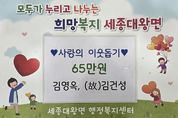 뉴한국방송뉴스통신사 신유철기자 기자 | 지난 29일 세종대왕면 구양리에 거주하는 김영옥, (故)김건성께서 관내 어려운 이웃을 위한 성금 65만원을 세종대왕면 지역사회보장협의체에 기탁했다. 김영옥, (故)김건성께서는 주변의 저소득 가구를 위해 성금을 기부하여 지역사회에 따뜻한 마음을 전했다. 김영옥님은 “기부한 성금이 소외된 이웃들에게 조금이나마 도움이 되길 바라며 기회가 있을 때마다 지역사회에 도움이 되도록 함께 마음을 나누겠다.”고 전했다. 홍광래 세종대왕면장은 “어려운 이웃을 위해 따뜻한 마음을 전해준 김영옥님에게 감사의 마음을 전하며 기부 해주신 성금은 어려운 이웃을 위해 잘 사용하겠다.”고 전했다. [뉴스출처 : 경기도 여주시]