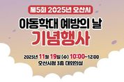 뉴한국방송뉴스통신사 신유철기자 기자 | 오산시는 오는 19일 ‘아동학대예방의 날’과 ‘아동학대예방주간’을 맞아 기념행사 및 온·오프라인 캠페인을 실시한다고 12일 밝혔다. 행사는 19일 오전 10시부터 12시까지 오산시청 대회의실에서 진행되며, ▲1부 아동학대예방의 날 기념식 식전공연, 유공자 표창 시상, 퍼포먼스, ▲2부 부모교육 특별강연으로 구성된다. 특별강연은 리플러스 인간연구소 박재연 소장이 ‘부모를 위한 건강한 대화방법’을 주제로 진행한다. 매년 11월 19일은 아동학대 예방과 방지에 대한 사회적 관심을 높이기 위해 제정된 법정기념일로, 오산시는 매년 기념식과 강연, 캠페인 등을 통해 아동학대 예방의 중요성을 알리는 다양한 활동을 추진해오고 있다. 시는 이달 25일까지 온라인 릴레이 캠페인도 함께 진행한다. 오산시민 누구나 SNS에 아동학대예방 메시지 또는 관련 사진을 업로드해 참여할 수 있다. 또한 11월 24일에는 시청 인근 주요 교차로에서 시민 대상 오프라인 홍보 캠페인을 실시해 아동학대 예방 인식 제고에 나설 예정이다. 박현주 아동복지과장은 “이번 행사가 아동학대 예방의 중요성을 되