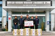 뉴한국방송뉴스통신사 신유철기자 기자 | 영주시는 지난 16일 ㈜예천친환경급식센터(대표 신규용)가 영주시청을 방문해 소면 300kg(81만 원 상당)을 기탁했다고 밝혔다. 이날 기탁식에는 ㈜예천친환경급식센터 신규용 대표와 유정근 영주시장 권한대행이 참석해 나눔의 의미를 함께 나누며 감사의 뜻을 전했다. 특히 이번 기부는 ‘희망2026 나눔캠페인’에 현물 기부로 참여한 것으로, 연말을 맞아 지역사회에 따뜻한 온기를 전하는 데 의미를 더했다. 이번에 기탁된 소면은 관내 경로식당과 장애인복지시설 등 지역 내 취약계층 이용 시설 16개소에 전달될 예정이다. 신규용 대표는 “연말을 맞아 지역 어르신들과 복지시설 이용자분들께 조금이나마 도움이 되고자 기탁을 결정했다”며, “앞으로도 지역과 함께 성장하는 기업으로서 지속적인 나눔 활동에 동참하겠다”고 말했다. 유정근 영주시장 권한대행은 “어려운 이웃을 위해 따뜻한 손길을 보내주신 ㈜예천친환경급식센터 신규용 대표께 깊이 감사드린다”며, “희망2026 나눔캠페인 참여를 통해 지역사회 전반에 따뜻한 연말 분위기 확산에 큰 힘이 되고 있다”고 밝혔다. &nb