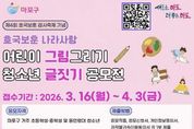 뉴한국방송뉴스통신사 신유철기자 기자 | 마포구는 제4회 호국보훈 감사축제를 맞아 어린이와 청소년이 국가보훈대상자의 희생과 헌신을 기억하고 나라사랑의 의미를 되새길 수 있도록 ‘호국보훈·나라사랑 어린이 그림그리기·청소년 글짓기 공모전’을 개최한다. 공모 기간은 4월 3일 오후 6시까지이며, 주민등록상 마포구에 거주하는 초등학생과 중학생 및 동연령대 청소년이면 누구나 참여할 수 있다. 공모 분야는 그림그리기와 글짓기 두 부문으로 진행된다. 그림그리기 부문은 초등학생을 대상으로 하며, 수채화·포스터·컷 만화 등 자유 형식의 작품을 8절지에 담아 제출하면 된다. 시상은 저학년부와 고학년부로 나눠 진행된다. 글짓기 부문은 초등학교 고학년과 중학생을 대상으로 하며, 시나 에세이 등 운문 또는 산문 형식으로 작성해 지정 양식에 맞춰 제출하면 된다. 지정 양식은 마포구 누리집 공지사항에서 내려받을 수 있으며, 시상은 초등부와 중등부로 나눠 진행한다. 그림과 글짓기(운문 또는 산문)는 중복하여 출품 가능하나, 각 부문별로 1인 1작품만 제출할 수 있다. 작품 주제는 독립운동가와 6·25 참