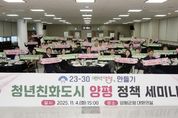 뉴한국방송뉴스통신사 신유철기자 기자 | 양평군은 지난 4일 오후 3시 양평군청 대회의실에서 ‘청년친화도시 조성을 위한 미래 방향성과 차별화 전략’을 주제로 ‘23-30 매력 양평 만들기’ 정책세미나를 개최했다. 이번 세미나는 청년이 머물고 싶은 도시, 청년이 주도적으로 참여할 수 있는 ‘매력양평’ 구현을 위한 실질적인 정책 방향을 논의하고자 마련됐다. 이날 행사에는 전진선 양평군수를 비롯해 양평군의회, 양평군 정책자문단, 청년정책위원회, 청년단체 등 관계자 100여 명이 참석했다. 1부에서는 인사말씀과 축사, 기념촬영이 진행됐으며, 2부에서는 손신 교수(아신대학교, 양평군 정책자문단 위원)의 ‘청년친화도시 조성을 위한 미래 방향성 및 차별화 전략’과 길청순 이사장(지역농업네트워크 서울경기제주협동조합, 양평군 정책자문단 위원)의 ‘농업·농촌의 미래와 청년농업인’ 발제가 이어졌다. 전진선 양평군수는 “청년이 머물고 싶은 도시, 청년이 주도적으로 참여할 수 있는 ‘매력양평’을 만들기 위해 행정과 지역사회가 함께 힘을 모아야 한다”며 “오늘 세미나에서 제시된 다양한 의견을 향후 청년정책에 적극 반영하겠다”고 밝혔다.