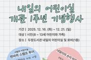 뉴한국방송뉴스통신사 신태공 기자 | 천안시 두정도서관은 오는 16~ 21일 ‘내일의 어린이실’ 개관 1주년 맞아 다채로운 기념행사를 운영한다고 15일 밝혔다. 도서관은 8~ 13세 어린이와 가족들을 대상으로 ▲내일의 어린이실 한바퀴 스탬프 투어 ▲1주년 축하 포토존 ▲내일이의 손이 머무른 책 전시 등을 선보인다. 개관일인 20일에는 어린이실에 방문하는 어린이들과 함께 축하 떡을 나누며 1주년의 의미를 함께 나눌 예정이다. 이와 함께 도서관 16주년과 크리스마스를 기념해 ‘반짝이는 리듬 케이크’ 타악기 콘서트와 특별 주문 케이크 만들기 등 다채로운 프로그램을 통해 1주년을 축하할 예정이다. 두정도서관 관계자는 “1주년 기념행사를 통해 어린이와 가족 모두가 행복한 시간을 보내기를 바란다”며 “내년에도 내일의 어린이실을 내실있게 운영할 수 있도록 노력할 것”이라고 말했다. 한편, 지난 11월까지 8만 3,000여 명의 어린이들이 내일의 어린이실을 이용했으며, 81개교 1,559명의 어린이가 회원으로 가입했다. [뉴스출처 : 충청남도 천안시]