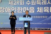 뉴한국방송뉴스통신사 신유철기자 기자 | 수원특례시의회는 9일, 수원실내체육관에서 열린 ‘제21회 수원특례시 장애인 한마음 체육대회 개회식’에 참석해 선수단을 격려했다. 이날 행사에는 이재식 의장을 비롯한 수원특례시의회 의원, 수원시장애인체육회와 수원시장애인복지단체연합회 관계자, 선수 400여 명과 보호자, 심판 등이 함께해 대회의 열기를 더했다. 이재식 의장은 축사를 통해 “이번 대회는 누가 더 잘하느냐의 경쟁보다 함께 뛰고 웃으며 서로의 마음을 나누는 자리가 되길 바란다”며, “수원특례시의회는 장애인 여러분이 스포츠를 통해 도전과 열정을 마음껏 펼칠 수 있도록 지속적으로 관심을 가지고 아낌없이 지원하겠다”고 밝혔다. 한편, 이번 대회는 수원시장애인체육회와 수원시장애인복지단체연합회가 주최·주관했으며, 슐런·투호·한궁·육상·족구 등 12개 종목에서 선수들이 기량을 겨루며 화합의 장을 만들었다. [뉴스출처 : 경기도 수원시의회]