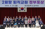 뉴한국방송뉴스통신사 신태공 기자 | 대전시교육청은 2월 27일, 대전시교육청 대강당에서 퇴직교원 정부포상 대상자와 가족 등이 참석한 가운데 ‘2026년 2월말 퇴직교원 정부포상 전수식’을 개최했다고 밝혔다. 이번 포상 수상자들은 오랜 세월 교직에 몸담으며 대전교육과 국가 교육 발전에 기여한 공로를 인정받았다. 훈격별 수상자는 황조근정훈장 7명, 홍조근정훈장 29명, 녹조근정훈장 19명, 옥조근정훈장 7명, 근정포장 10명, 대통령표창 3명, 교육부장관 표창 5명 등 총 80명이다. 퇴직교원을 대표해 소회를 밝힌 대전문지중학교 박미혜 교장은 정든 교정을 떠나는 아쉬움과 함께 그동안 뜻을 같이한 동료 교육 가족들에게 깊은 감사의 마음을 전했다. 설동호 대전광역시교육감은 “교육에 대한 사랑과 열정으로 국가와 대전교육 발전을 위해 헌신한 선생님들께 존경과 축하의 마음을 전한다”라며 “대전교육가족은 언제나 선생님들의 노고를 기억하고 앞날을 응원할 것”이라고 밝혔다. [뉴스출처 : 대전시교육청]