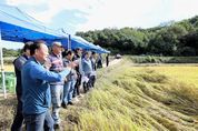 뉴한국방송뉴스통신사 김성의 기자 | 무주군이 벼 작목의 경쟁력 강화를 위해 품종 다변화를 시도하고 있는 가운데 지난 15일에는 안성면 장기리 일원에서 ‘신동진1’ 생육평가회를 가졌다. 이날 평가회는 해당 품종의 생육 상태와 병해충 저항성, 품질 등을 종합적으로 관찰하고 ‘신동진’과 ‘참동진’ 등 다른 품종과의 비교를 통해 보급 확대 방안을 모색한다는 취지에서 마련된 것으로, 황인홍 무주군수를 비롯한 6개 읍·면 이장, 그리고 지역 내 벼 재배농가 등 60여 명이 참석해 ‘신동진1’의 주요 특성과 전시포 운영 현황을 공유하고 생육 상황을 직접 점검했다. 황인홍 무주군수는 “이 자리는 다수확 품종의 공공비축미 제외 정책에 따른 후속 품종의 보급이 절실한 상황에서 우리 지역에 적합한 벼 품종을 선정하고 재배 기술 공유, 생산성과 품질 개선, 기후변화 대응력을 강화한다는 측면에서 매우 중요한 의미가 있다”라며 “앞으로 벼 재배 안정화는 물론, 병해충 예찰과 방제, 재배 기술 교육 등 강화를 통해 경쟁력을 키워 나갈 것”이라고 밝혔다. ‘신동진1’은 ‘신동진’과 유전적으로 유사하나 품질이 강화된