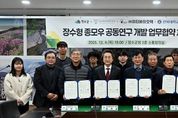 뉴한국방송뉴스통신사 김성의 기자 | 장수군은 장수한우지방공사, 이티바이오텍(주), 전북대학교와 장수군청 회의실에서 장수한우 품질 고급화를 위한 ‘장수형 저탄소 종모우 개발’ 공동연구 상호협력 업무협약(MOU)을 체결했다고 11일 밝혔다. 이번 협약은 협약기관 간 상호 업무협조 체계를 구축해 장수 한우 산업의 경쟁력을 높이기 위한 장수 지역 사양환경에 적합한 우수 유전자원을 확보하고, 탄소배출을 줄이면서도 생산성과 품질을 높일 수 있는 종모우 개발을 위해 마련됐다. 특히 종모우 개발을 통해 장수 한우 고유의 유전형질을 확립하고 탄소배출 저감과 생산성 향상을 동시에 달성하는 것이 핵심 목표다. 협약에 따라 군은 저탄소 종모우 개발을 위한 사업 총괄 및 행·재정적 지원을 하고 장수한우지방공사는 채정·가공·사양관리와 농가 컨설팅에 나선다. 또한 이티바이오텍은 유전체 기반 연구개발을 진행하고 전북대학교는 유전 능력 평가와 우량 암소·후보 종모우 선발을 각각 담당한다. 장수군은 이번 공동연구를 최근 지정된 전북특별자치도 농생명산업지구 내 ‘저탄소한우 산업지구’ 조성사업과 연계해 2030년까지 단계