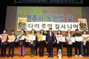 뉴한국방송뉴스통신사 김성의 기자 | 100세 시대를 맞아 전주지역 노인들의 행복하고 건강한 노후생활을 함께 염원하는 노인의날 기념식이 열렸다. 전주시와 대한노인회 전주시지회(지회장 홍성언)는 14일 전주학생교육문화관 공연장에서 우범기 전주시장과 최주만 전주시의회 부의장, 김두봉 대한노인회 전북특별자치도연합회장, 표창 수상자 등 1200여 명이 참석한 가운데 ‘제29회 전주시 노인의날 기념식’을 가졌다. 송민주 대한노인회 전주시지회 사무국장의 사회로 진행된 이날 기념식은 △무지개예술자원봉사단(단장 고대현)과 아름다운 실버 전주의꽃(단장 김인식)의 식전 공연 △노인 강령 낭독 △청려장(장수지팡이) 수여 △전주시장 및 전주시의장 표창 수여식 △노인복지공로자에 대한 공로장 수여식 등의 순으로 진행됐다. 특히 우범기 전주시장은 이날 기념식에서 올해 100세를 맞이한 김옥순 어르신(여, 덕진동)에게 무병장수의 상징인 청려지팡이를 전달했으며, 홍성언 지회장은 축하의 꽃다발을 선물했다. 홍성언 대한노인회 전주시지회장은 “풍성했던 한가위도 지나가고, 땀과 노력으로 이뤄낸 결실의 계절 가을을 맞이해 참석해 주신 우