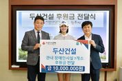 뉴한국방송뉴스통신사 양호선기자 기자 | 두산건설은 지난 28일 원주시 장애인복지시설 지원을 위한 기부금 1,000만 원을 전달하며 지역사회를 위한 나눔을 실천했다. 전달식은 원주시청에서 진행됐으며, 김문기 부시장과 두산건설 오세욱 상무, 두산건설We’ve 골프단 프로골퍼 박결 선수 등이 참석했다. 이번 기부금은 사회복지공동모금회 강원도지회를 통해 원주시 장애인복지시설 7곳에 전달될 예정이다. 두산건설은 장애인의 자립과 사회활동 참여 확대를 위해 지속적으로 사회공헌 활동을 진행하고 있다. 대표적으로 2023년과 2024년, ‘두산건설We’ve 챔피언십’ 갤러리 티켓 판매 대금을 장애인 체육 종목 및 선수 후원에 활용했으며, 지난해에는 골프단 재능 기부를 통해 조성된 기부금을 청각 장애 아동에 전달했다. 최근에는 프로골퍼 신지애 선수와 매칭그랜트 방식의 공동 기부를 진행하며 사회 공헌의 폭을 더욱 넓혔다. 선수 개인의 선한 영향력과 기업의 사회적 책임을 결합한 이번 기부를 비롯해, 두산건설은 스포츠 연계 사회 공헌과 지역사회 협력 활동을 통해 사회적 약자를 위한 실질적인 지원을 이어가고 있다. &nbs