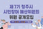 뉴한국방송뉴스통신사 권영분기자 기자 | 청주시는 시민참여예산제의 효율적인 운영과 활성화를 위해 오는 18일까지 제7기 청주시 시민참여예산위원 14명을 공개모집한다. 시민참여예산위원회는 예산에 대한 시민들의 의견을 수렴·집약하고 수립 과정에 참여해 예산안에 대한 의견을 제출하는 기능을 수행한다. 시민이 제안한 사업에 대한 우선순위 결정, 추진 결과 점검 등 과정 전반에 직접 참여하게 된다. 이번 공개모집 인원은 14명으로 읍·면 8명, 동 6명이다. 임기는 2026년 1월 1일부터 2027년 12월 31일까지 2년간이다. 신청 자격은 청주시에 주민등록이 되어 있거나 청주시에 영업소 본점 또는 지점을 둔 사업체의 대표자・임직원, 청주시 소재 기관·단체에 근무하는 사람 등이다. 세금 및 과태료 체납자는 신청할 수 없다. 신청은 시 누리집 고시공고에서 신청서를 내려받아 18일까지 시 예산과, 구청 행정지원과, 읍·면·동 행정복지센터에 방문하거나 이메일, 우편 등을 통해 제출하면 된다. 시는 연말까지 선정해 개별통지할 계획이다. 시 관계자는 “투명하고 효율적
