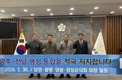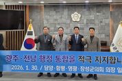 뉴한국방송뉴스통신사 신다은기자 기자 | 담양군의회가 인구 소멸 위기 극복과 지역 경쟁력 강화를 위해 인근 의회와 손을 맞잡고 광주-전남 행정통합 추진에 힘을 보탰다. 담양·함평·영광·장성군 의장단은 ‘광주-전남 행정통합 염원 공동 퍼포먼스’를 펼치며, 행정구역의 경계를 넘어선 초광역 협력 체계 구축에 대한 강력한 의지를 표명했다. 이번 퍼포먼스는 단순한 선언을 넘어, 광주와 전남이 하나의 생활권이자 경제권으로 재편되어야만 수도권 집중화에 대응하고 자생적인 발전 동력을 얻을 수 있다는 절박한 공감대 속에서 마련됐다. 참석한 의장단은 성명을 통해 “행정통합은 지역의 미래 경쟁력 확보와 균형발전을 위해 더 이상 미룰 수 없는 시대적 소명”이라며, “지금이야말로 광주와 전남의 백년대계를 결정할 골든타임”이라고 강조했다. 특히 장명영 의장은 “담양은 광주와 인접한 지리적 이점과 생태문화 자원을 동시에 갖춘 지역으로, 행정통합 시 시너지 효과가 가장 클 것으로 기대되는 곳”이라며, “통합 과정에서 군민의 목소리가 소외되지 않고 실질적인 복지 증진과 지역 발전으로 이어질 수 있도록 정책적 역할을 다하겠다”고 말